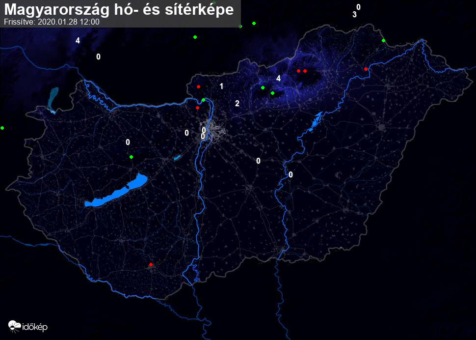 Hótérképünkön hazánk síterepei mellett észlelőink által jelzett hóvastagság adatok is