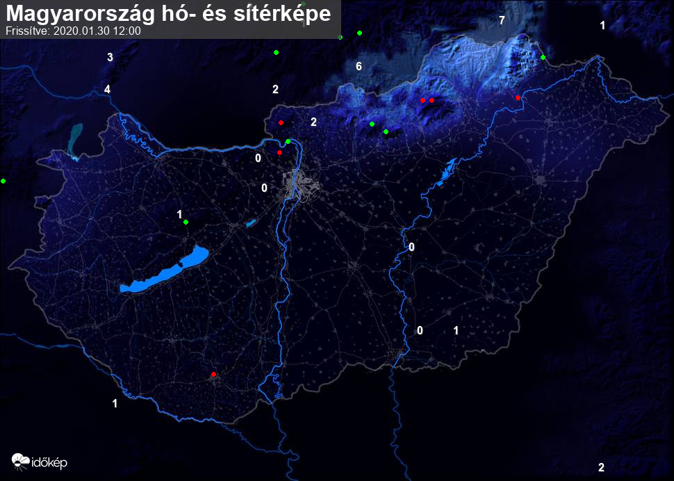 Hótérképünkön hazánk síterepei mellett észlelőink által jelzett hóvastagság adatok is