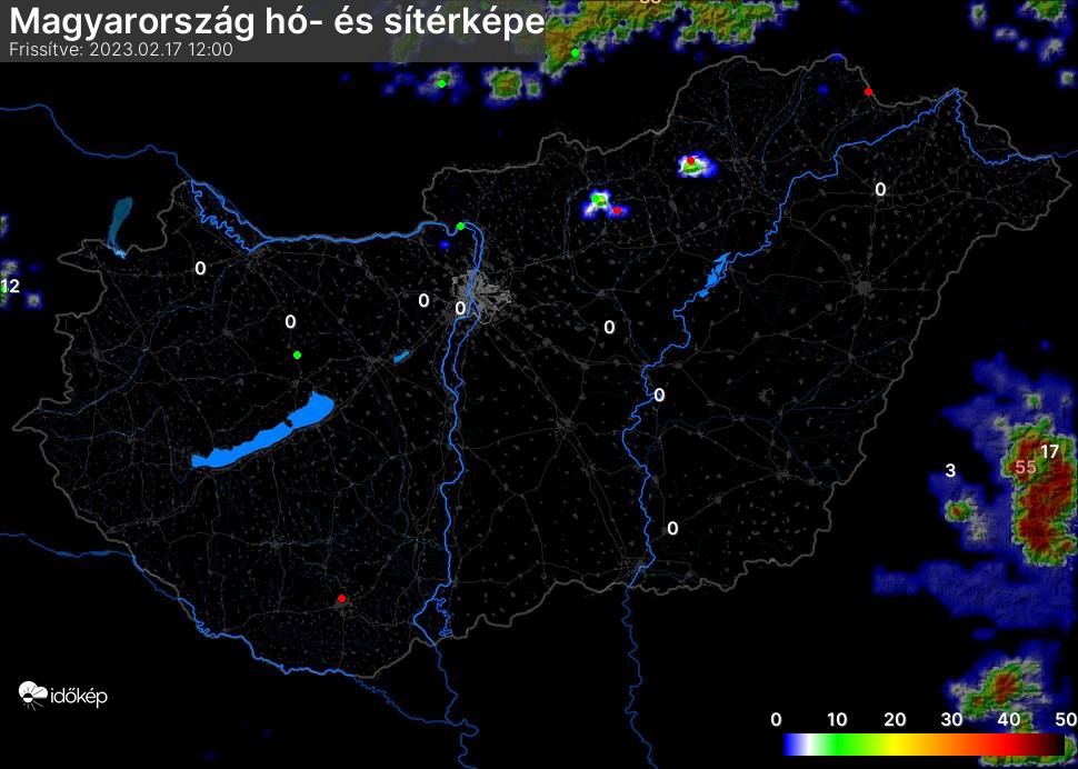 Hótérképünkön hazánk síterepei mellett észlelőink által jelzett hóvastagság adatok is