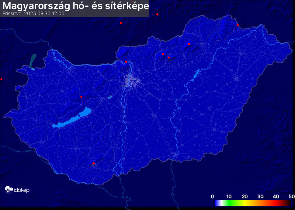 Hótérképünkön hazánk síterepei mellett észlelőink által jelzett hóvastagság adatok is