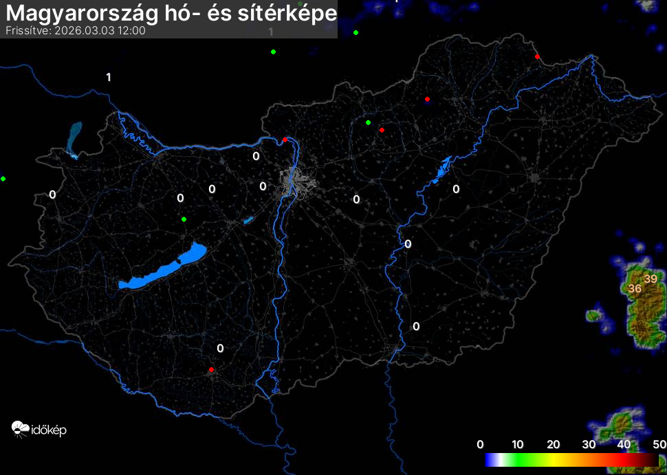 Hótérképünkön hazánk síterepei mellett észlelőink által jelzett hóvastagság adatok is
