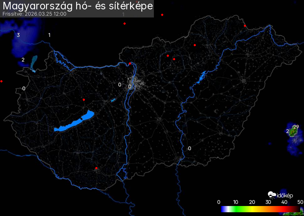 Hótérképünkön hazánk síterepei mellett észlelőink által jelzett hóvastagság adatok is