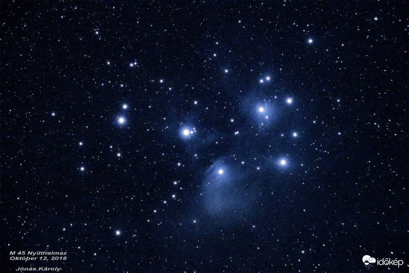 Az M45 Nyilthalmaz (Fiastyúk) és az azt körülölelő pór és gázfelhő. Távolság 445 fényév.