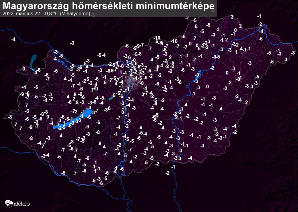 A minimumtérképen kirajzolódik az adott éjszaka mért legalacsonyabb hőmérsékletek térbeli eloszlása. Az adott nap hőmérsékleti minimumát télen előző este 7 és aznap reggel 7 óra, nyáron előző este 8 és aznap reggel 8 óra között mért legalacsonyabb értékkel adjuk meg. Adatbeküldés: aznap délután 4 óráig.