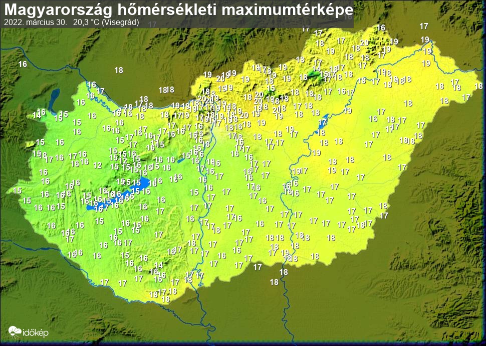 A maximumtérképen kirajzolódik az adott napon mért legmagasabb hőmérsékletek térbeli eloszlása. Az adott nap hőmérsékleti maximumát télen reggel és este 7 óra, nyáron reggel és este 8 óra között mért legmagasabb értékkel adjuk meg. Adatbeküldés: következő nap reggel 4 óráig.