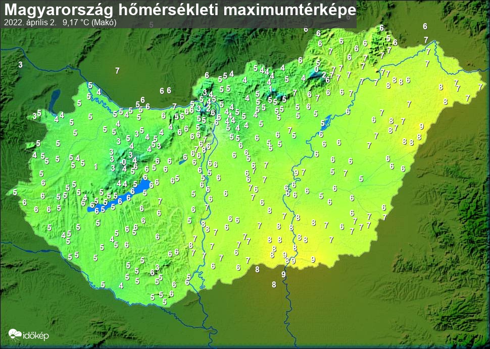 A maximumtérképen kirajzolódik az adott napon mért legmagasabb hőmérsékletek térbeli eloszlása. Az adott nap hőmérsékleti maximumát télen reggel és este 7 óra, nyáron reggel és este 8 óra között mért legmagasabb értékkel adjuk meg. Adatbeküldés: következő nap reggel 4 óráig.