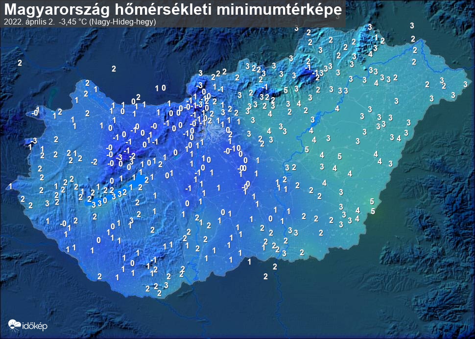 A minimumtérképen kirajzolódik az adott éjszaka mért legalacsonyabb hőmérsékletek térbeli eloszlása. Az adott nap hőmérsékleti minimumát télen előző este 7 és aznap reggel 7 óra, nyáron előző este 8 és aznap reggel 8 óra között mért legalacsonyabb értékkel adjuk meg. Adatbeküldés: aznap délután 4 óráig.