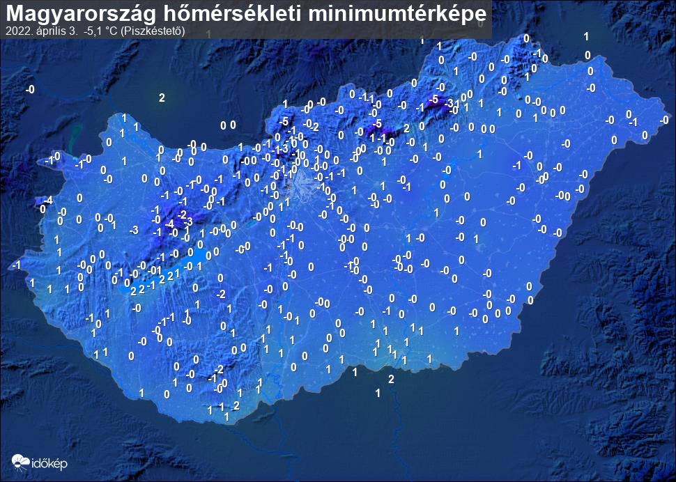 A minimumtérképen kirajzolódik az adott éjszaka mért legalacsonyabb hőmérsékletek térbeli eloszlása. Az adott nap hőmérsékleti minimumát télen előző este 7 és aznap reggel 7 óra, nyáron előző este 8 és aznap reggel 8 óra között mért legalacsonyabb értékkel adjuk meg. Adatbeküldés: aznap délután 4 óráig.