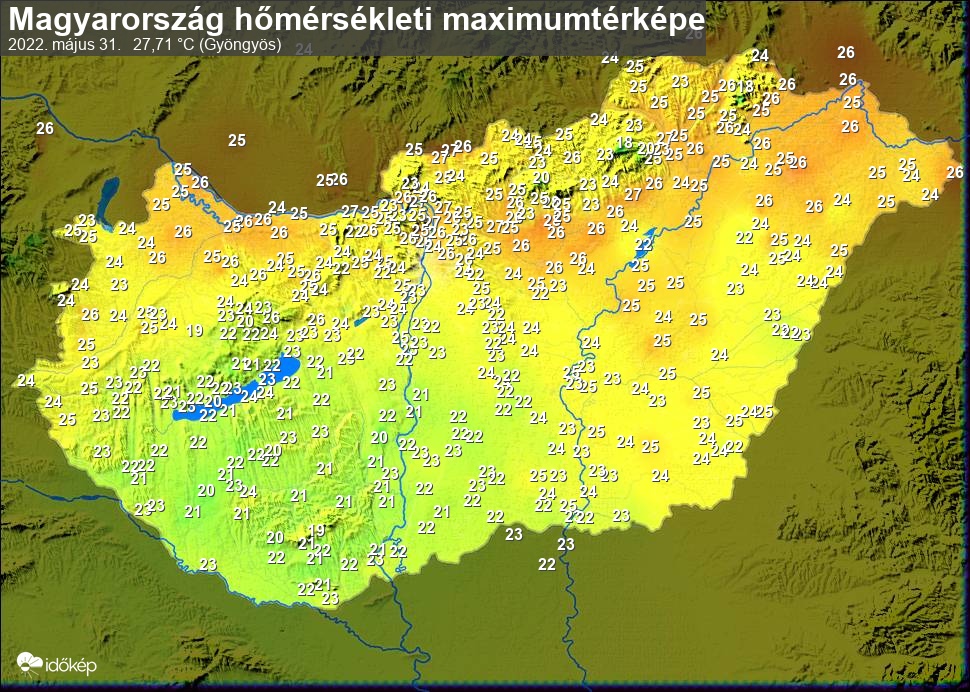 A maximumtérképen kirajzolódik az adott napon mért legmagasabb hőmérsékletek térbeli eloszlása. Az adott nap hőmérsékleti maximumát télen reggel és este 7 óra, nyáron reggel és este 8 óra között mért legmagasabb értékkel adjuk meg. Adatbeküldés: következő nap reggel 4 óráig.