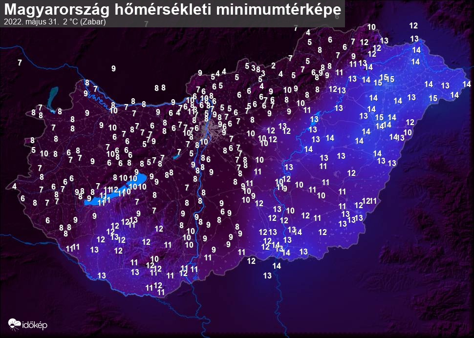 A minimumtérképen kirajzolódik az adott éjszaka mért legalacsonyabb hőmérsékletek térbeli eloszlása. Az adott nap hőmérsékleti minimumát télen előző este 7 és aznap reggel 7 óra, nyáron előző este 8 és aznap reggel 8 óra között mért legalacsonyabb értékkel adjuk meg. Adatbeküldés: aznap délután 4 óráig.