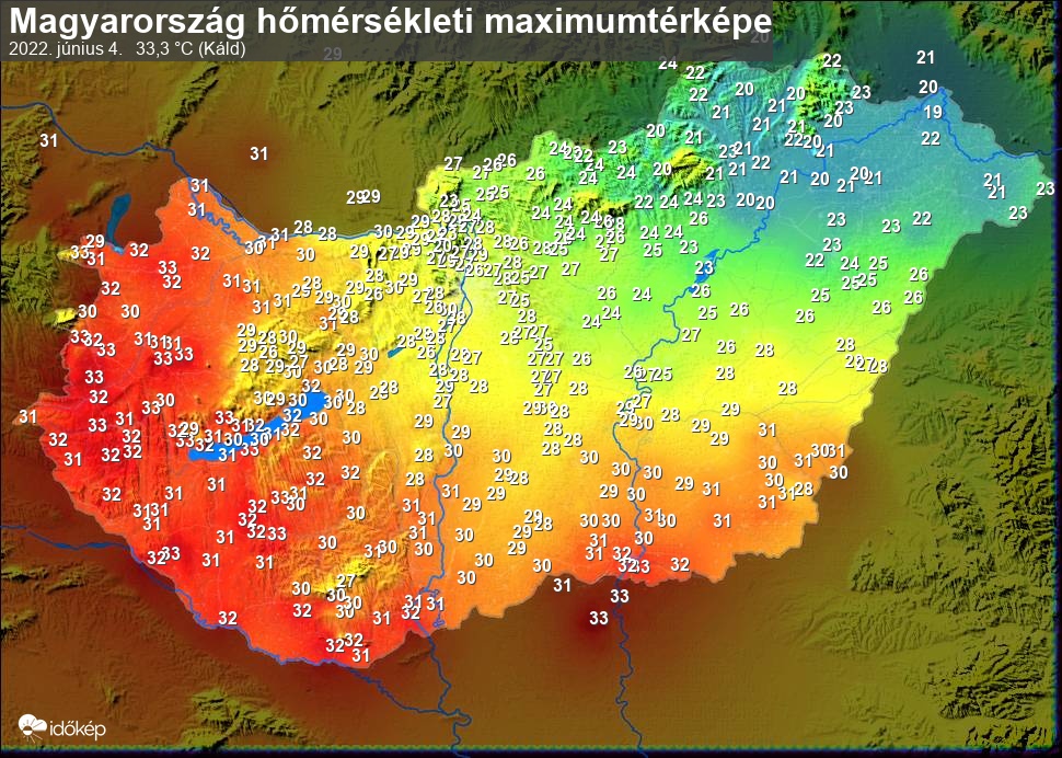 A maximumtérképen kirajzolódik az adott napon mért legmagasabb hőmérsékletek térbeli eloszlása. Az adott nap hőmérsékleti maximumát télen reggel és este 7 óra, nyáron reggel és este 8 óra között mért legmagasabb értékkel adjuk meg. Adatbeküldés: következő nap reggel 4 óráig.