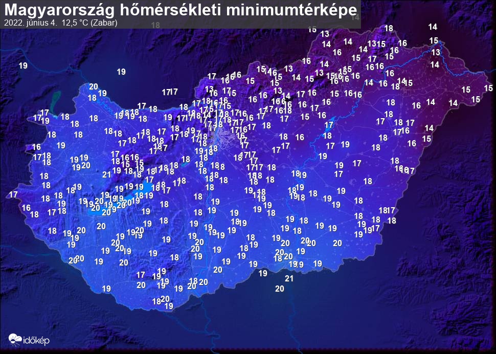 A minimumtérképen kirajzolódik az adott éjszaka mért legalacsonyabb hőmérsékletek térbeli eloszlása. Az adott nap hőmérsékleti minimumát télen előző este 7 és aznap reggel 7 óra, nyáron előző este 8 és aznap reggel 8 óra között mért legalacsonyabb értékkel adjuk meg. Adatbeküldés: aznap délután 4 óráig.