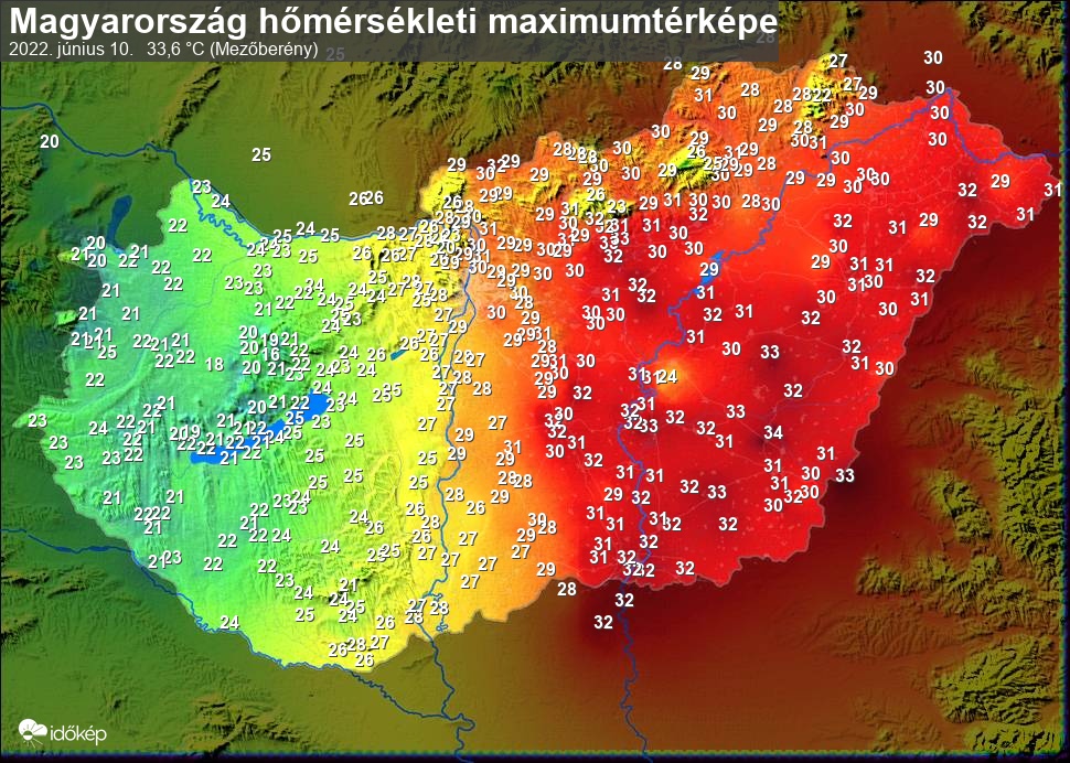 A maximumtérképen kirajzolódik az adott napon mért legmagasabb hőmérsékletek térbeli eloszlása. Az adott nap hőmérsékleti maximumát télen reggel és este 7 óra, nyáron reggel és este 8 óra között mért legmagasabb értékkel adjuk meg. Adatbeküldés: következő nap reggel 4 óráig.