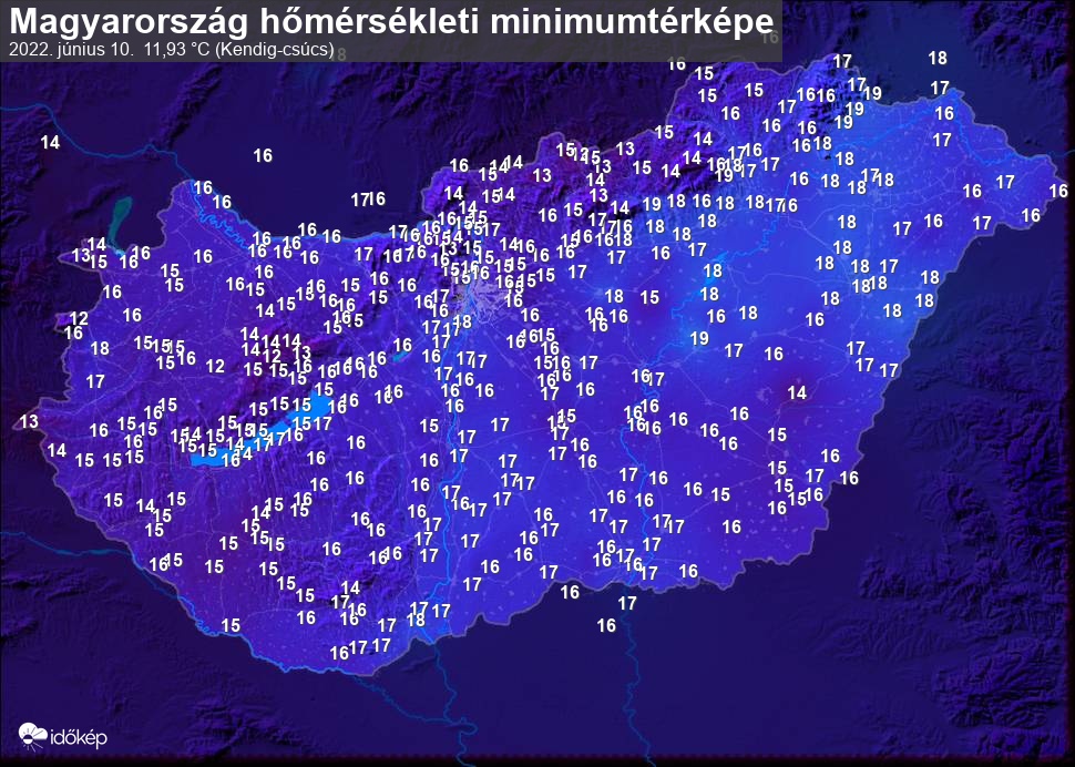 A minimumtérképen kirajzolódik az adott éjszaka mért legalacsonyabb hőmérsékletek térbeli eloszlása. Az adott nap hőmérsékleti minimumát télen előző este 7 és aznap reggel 7 óra, nyáron előző este 8 és aznap reggel 8 óra között mért legalacsonyabb értékkel adjuk meg. Adatbeküldés: aznap délután 4 óráig.