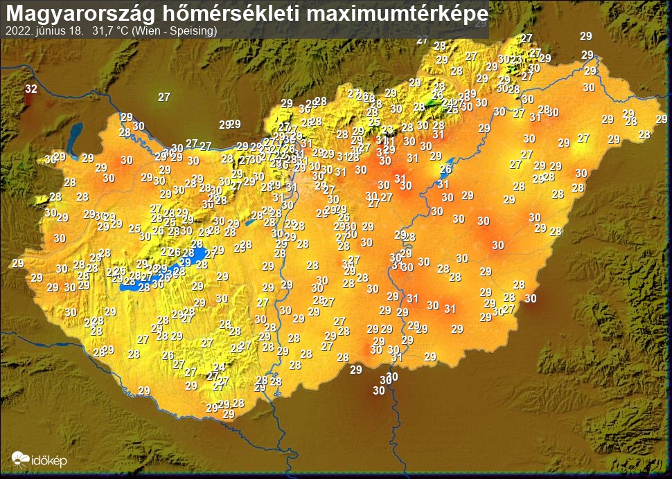 A maximumtérképen kirajzolódik az adott napon mért legmagasabb hőmérsékletek térbeli eloszlása. Az adott nap hőmérsékleti maximumát télen reggel és este 7 óra, nyáron reggel és este 8 óra között mért legmagasabb értékkel adjuk meg. Adatbeküldés: következő nap reggel 4 óráig.