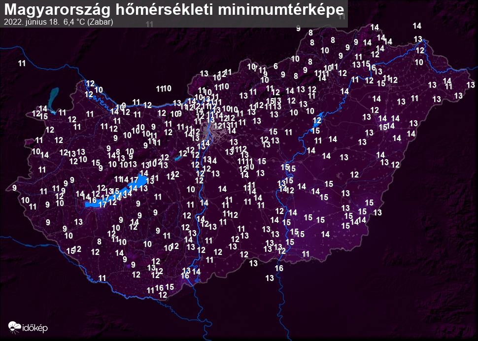 A minimumtérképen kirajzolódik az adott éjszaka mért legalacsonyabb hőmérsékletek térbeli eloszlása. Az adott nap hőmérsékleti minimumát télen előző este 7 és aznap reggel 7 óra, nyáron előző este 8 és aznap reggel 8 óra között mért legalacsonyabb értékkel adjuk meg. Adatbeküldés: aznap délután 4 óráig.