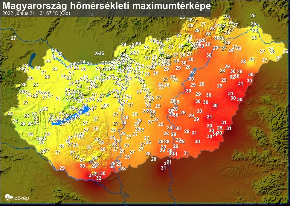 A maximumtérképen kirajzolódik az adott napon mért legmagasabb hőmérsékletek térbeli eloszlása. Az adott nap hőmérsékleti maximumát télen reggel és este 7 óra, nyáron reggel és este 8 óra között mért legmagasabb értékkel adjuk meg. Adatbeküldés: következő nap reggel 4 óráig.