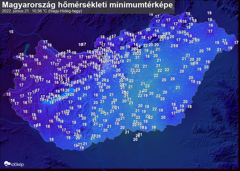 A minimumtérképen kirajzolódik az adott éjszaka mért legalacsonyabb hőmérsékletek térbeli eloszlása. Az adott nap hőmérsékleti minimumát télen előző este 7 és aznap reggel 7 óra, nyáron előző este 8 és aznap reggel 8 óra között mért legalacsonyabb értékkel adjuk meg. Adatbeküldés: aznap délután 4 óráig.
