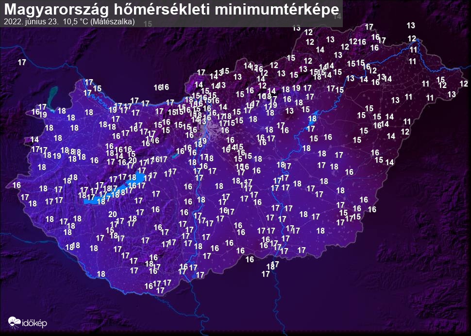 A minimumtérképen kirajzolódik az adott éjszaka mért legalacsonyabb hőmérsékletek térbeli eloszlása. Az adott nap hőmérsékleti minimumát télen előző este 7 és aznap reggel 7 óra, nyáron előző este 8 és aznap reggel 8 óra között mért legalacsonyabb értékkel adjuk meg. Adatbeküldés: aznap délután 4 óráig.