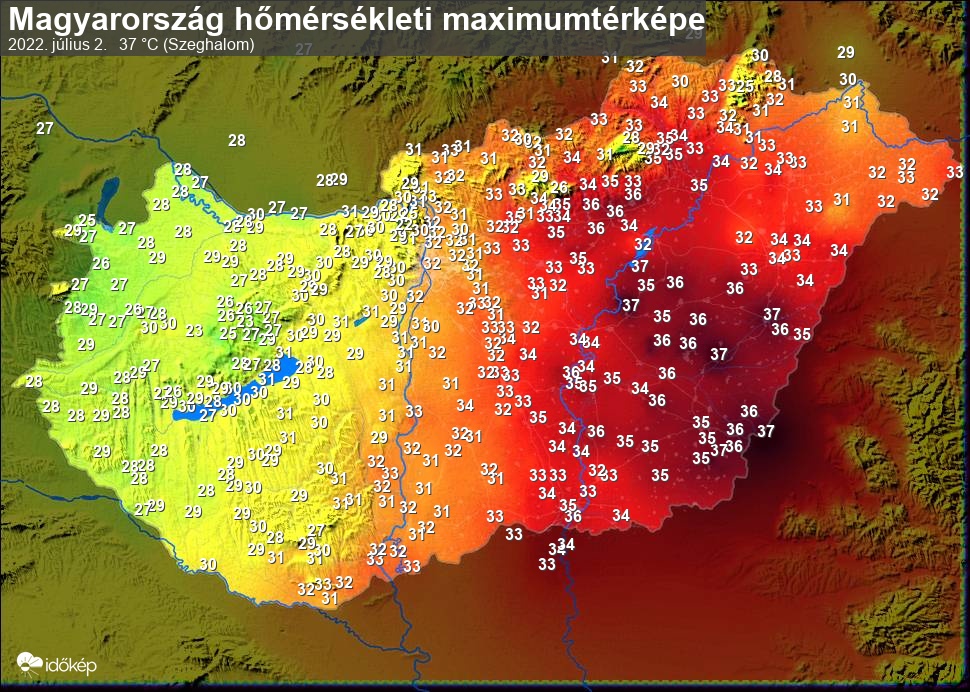 A maximumtérképen kirajzolódik az adott napon mért legmagasabb hőmérsékletek térbeli eloszlása. Az adott nap hőmérsékleti maximumát télen reggel és este 7 óra, nyáron reggel és este 8 óra között mért legmagasabb értékkel adjuk meg. Adatbeküldés: következő nap reggel 4 óráig.