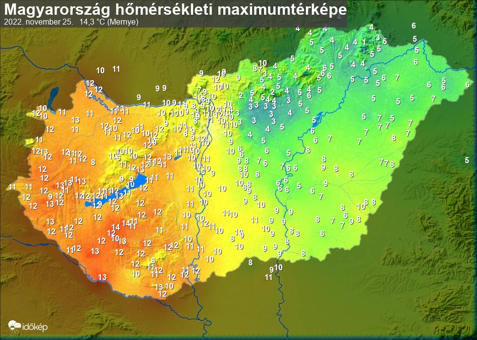A maximumtérképen kirajzolódik az adott napon mért legmagasabb hőmérsékletek térbeli eloszlása. Az adott nap hőmérsékleti maximumát télen reggel és este 7 óra, nyáron reggel és este 8 óra között mért legmagasabb értékkel adjuk meg. Adatbeküldés: következő nap reggel 4 óráig.