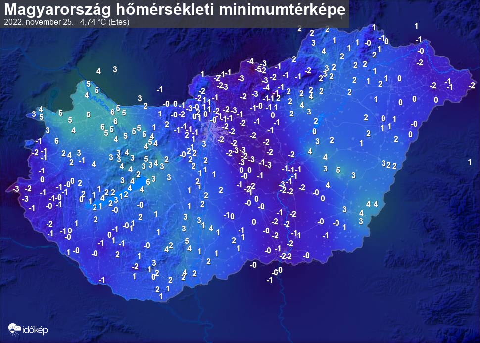 A minimumtérképen kirajzolódik az adott éjszaka mért legalacsonyabb hőmérsékletek térbeli eloszlása. Az adott nap hőmérsékleti minimumát télen előző este 7 és aznap reggel 7 óra, nyáron előző este 8 és aznap reggel 8 óra között mért legalacsonyabb értékkel adjuk meg. Adatbeküldés: aznap délután 4 óráig.