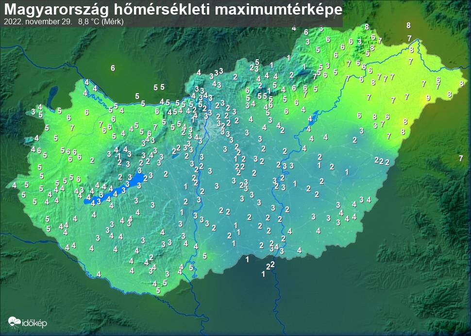 A maximumtérképen kirajzolódik az adott napon mért legmagasabb hőmérsékletek térbeli eloszlása. Az adott nap hőmérsékleti maximumát télen reggel és este 7 óra, nyáron reggel és este 8 óra között mért legmagasabb értékkel adjuk meg. Adatbeküldés: következő nap reggel 4 óráig.