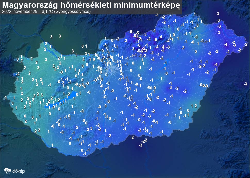 A minimumtérképen kirajzolódik az adott éjszaka mért legalacsonyabb hőmérsékletek térbeli eloszlása. Az adott nap hőmérsékleti minimumát télen előző este 7 és aznap reggel 7 óra, nyáron előző este 8 és aznap reggel 8 óra között mért legalacsonyabb értékkel adjuk meg. Adatbeküldés: aznap délután 4 óráig.