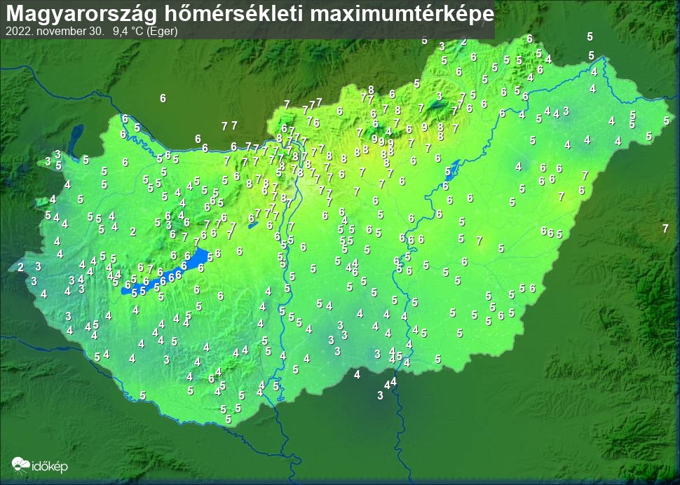 A maximumtérképen kirajzolódik az adott napon mért legmagasabb hőmérsékletek térbeli eloszlása. Az adott nap hőmérsékleti maximumát télen reggel és este 7 óra, nyáron reggel és este 8 óra között mért legmagasabb értékkel adjuk meg. Adatbeküldés: következő nap reggel 4 óráig.