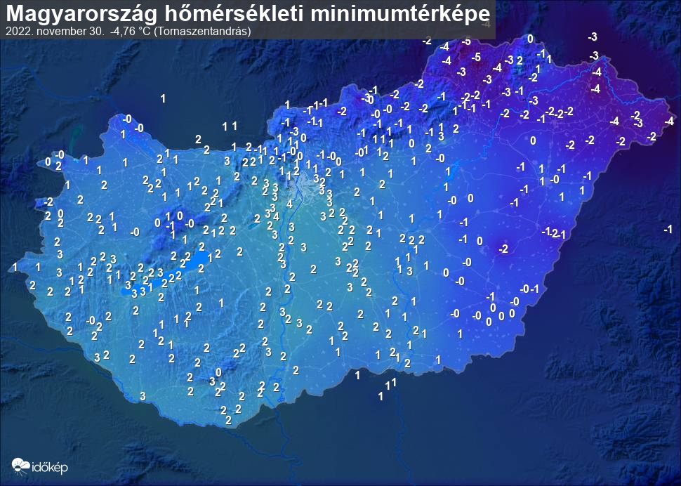 A minimumtérképen kirajzolódik az adott éjszaka mért legalacsonyabb hőmérsékletek térbeli eloszlása. Az adott nap hőmérsékleti minimumát télen előző este 7 és aznap reggel 7 óra, nyáron előző este 8 és aznap reggel 8 óra között mért legalacsonyabb értékkel adjuk meg. Adatbeküldés: aznap délután 4 óráig.
