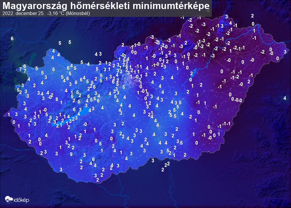 A minimumtérképen kirajzolódik az adott éjszaka mért legalacsonyabb hőmérsékletek térbeli eloszlása. Az adott nap hőmérsékleti minimumát télen előző este 7 és aznap reggel 7 óra, nyáron előző este 8 és aznap reggel 8 óra között mért legalacsonyabb értékkel adjuk meg. Adatbeküldés: aznap délután 4 óráig.