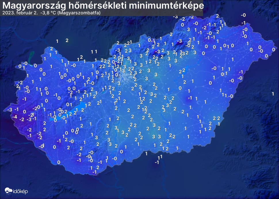 A minimumtérképen kirajzolódik az adott éjszaka mért legalacsonyabb hőmérsékletek térbeli eloszlása. Az adott nap hőmérsékleti minimumát télen előző este 7 és aznap reggel 7 óra, nyáron előző este 8 és aznap reggel 8 óra között mért legalacsonyabb értékkel adjuk meg. Adatbeküldés: aznap délután 4 óráig.