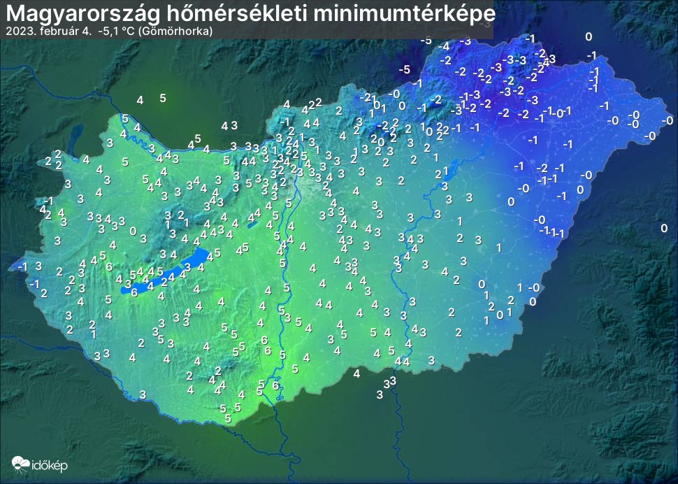 A minimumtérképen kirajzolódik az adott éjszaka mért legalacsonyabb hőmérsékletek térbeli eloszlása. Az adott nap hőmérsékleti minimumát télen előző este 7 és aznap reggel 7 óra, nyáron előző este 8 és aznap reggel 8 óra között mért legalacsonyabb értékkel adjuk meg. Adatbeküldés: aznap délután 4 óráig.