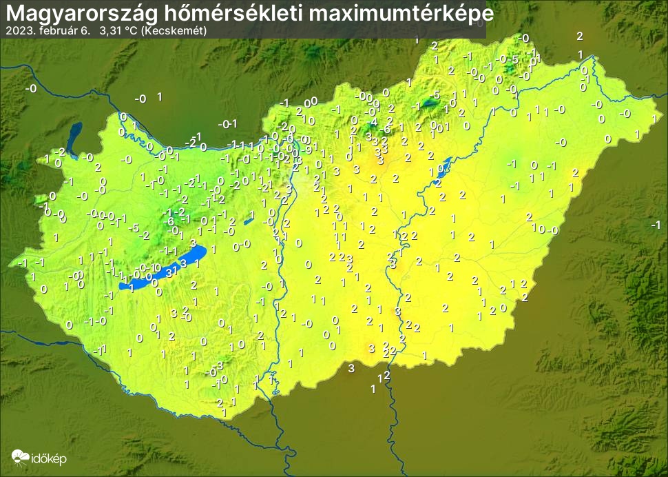 A maximumtérképen kirajzolódik az adott napon mért legmagasabb hőmérsékletek térbeli eloszlása. Az adott nap hőmérsékleti maximumát télen reggel és este 7 óra, nyáron reggel és este 8 óra között mért legmagasabb értékkel adjuk meg. Adatbeküldés: következő nap reggel 4 óráig.