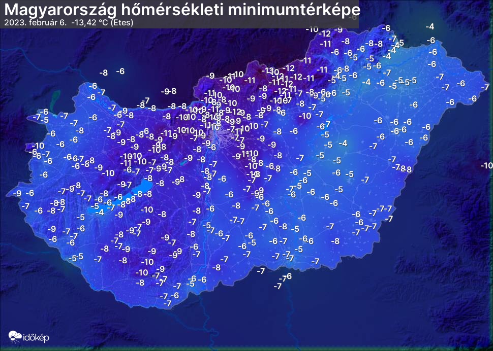 A minimumtérképen kirajzolódik az adott éjszaka mért legalacsonyabb hőmérsékletek térbeli eloszlása. Az adott nap hőmérsékleti minimumát télen előző este 7 és aznap reggel 7 óra, nyáron előző este 8 és aznap reggel 8 óra között mért legalacsonyabb értékkel adjuk meg. Adatbeküldés: aznap délután 4 óráig.