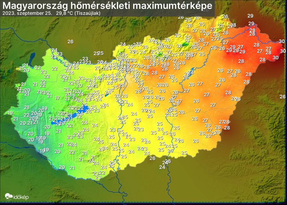 A maximumtérképen kirajzolódik az adott napon mért legmagasabb hőmérsékletek térbeli eloszlása. Az adott nap hőmérsékleti maximumát télen reggel és este 7 óra, nyáron reggel és este 8 óra között mért legmagasabb értékkel adjuk meg. Adatbeküldés: következő nap reggel 4 óráig.