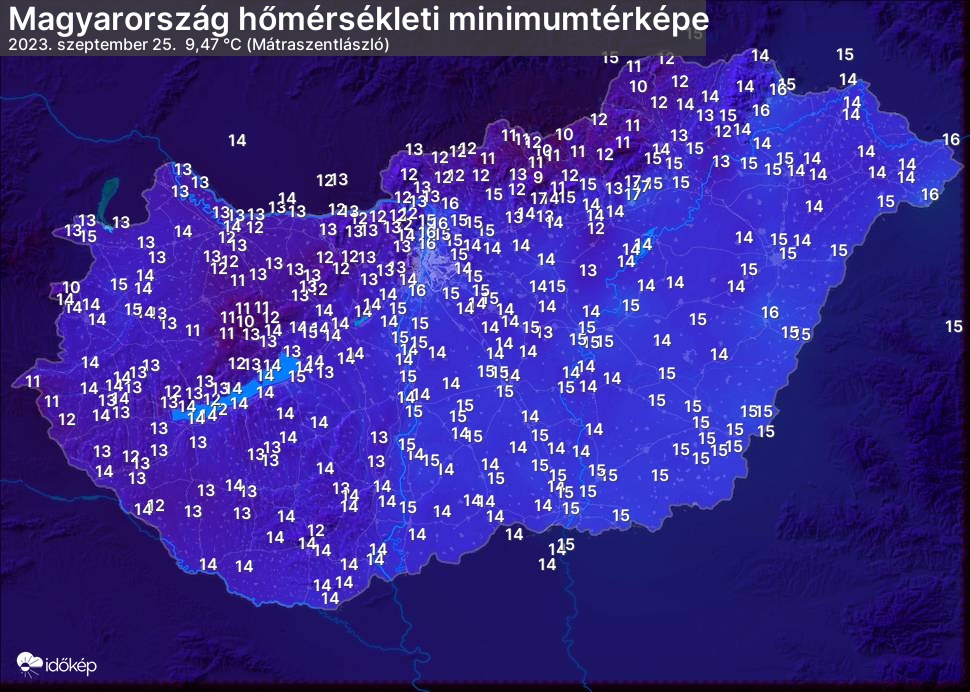 A minimumtérképen kirajzolódik az adott éjszaka mért legalacsonyabb hőmérsékletek térbeli eloszlása. Az adott nap hőmérsékleti minimumát télen előző este 7 és aznap reggel 7 óra, nyáron előző este 8 és aznap reggel 8 óra között mért legalacsonyabb értékkel adjuk meg. Adatbeküldés: aznap délután 4 óráig.