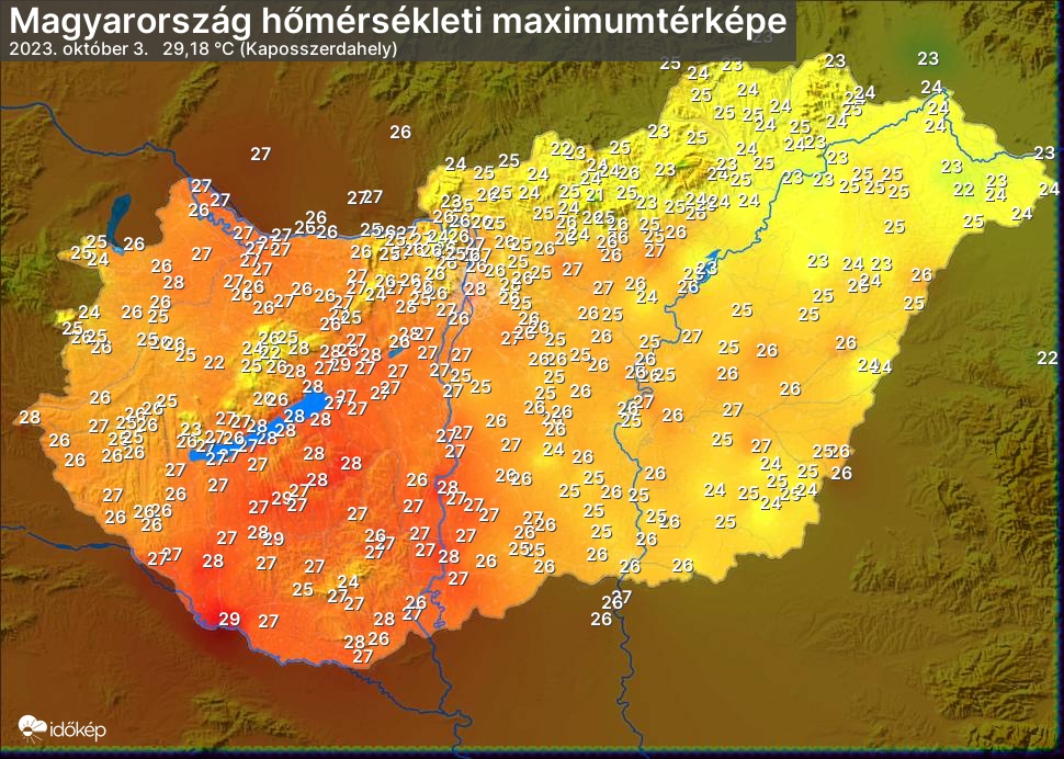 A maximumtérképen kirajzolódik az adott napon mért legmagasabb hőmérsékletek térbeli eloszlása. Az adott nap hőmérsékleti maximumát télen reggel és este 7 óra, nyáron reggel és este 8 óra között mért legmagasabb értékkel adjuk meg. Adatbeküldés: következő nap reggel 4 óráig.