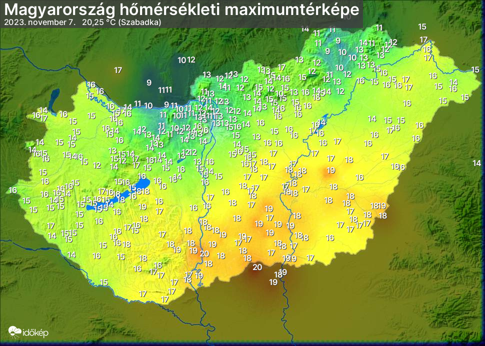 A maximumtérképen kirajzolódik az adott napon mért legmagasabb hőmérsékletek térbeli eloszlása. Az adott nap hőmérsékleti maximumát télen reggel és este 7 óra, nyáron reggel és este 8 óra között mért legmagasabb értékkel adjuk meg. Adatbeküldés: következő nap reggel 4 óráig.
