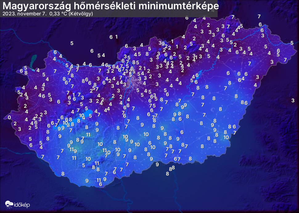 A minimumtérképen kirajzolódik az adott éjszaka mért legalacsonyabb hőmérsékletek térbeli eloszlása. Az adott nap hőmérsékleti minimumát télen előző este 7 és aznap reggel 7 óra, nyáron előző este 8 és aznap reggel 8 óra között mért legalacsonyabb értékkel adjuk meg. Adatbeküldés: aznap délután 4 óráig.