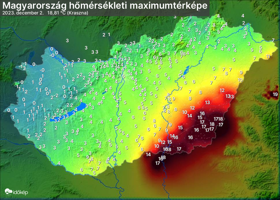 A maximumtérképen kirajzolódik az adott napon mért legmagasabb hőmérsékletek térbeli eloszlása. Az adott nap hőmérsékleti maximumát télen reggel és este 7 óra, nyáron reggel és este 8 óra között mért legmagasabb értékkel adjuk meg. Adatbeküldés: következő nap reggel 4 óráig.