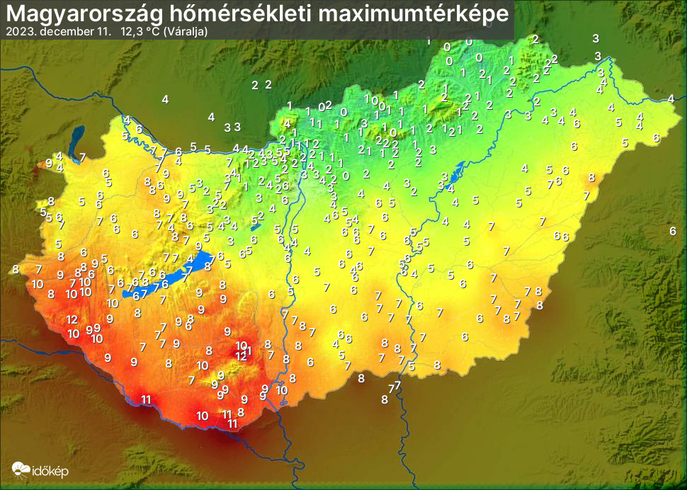 A maximumtérképen kirajzolódik az adott napon mért legmagasabb hőmérsékletek térbeli eloszlása. Az adott nap hőmérsékleti maximumát télen reggel és este 7 óra, nyáron reggel és este 8 óra között mért legmagasabb értékkel adjuk meg. Adatbeküldés: következő nap reggel 4 óráig.