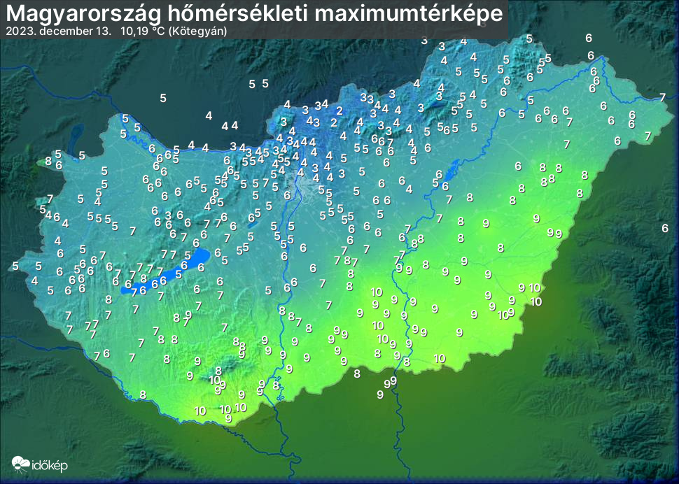 A maximumtérképen kirajzolódik az adott napon mért legmagasabb hőmérsékletek térbeli eloszlása. Az adott nap hőmérsékleti maximumát télen reggel és este 7 óra, nyáron reggel és este 8 óra között mért legmagasabb értékkel adjuk meg. Adatbeküldés: következő nap reggel 4 óráig.