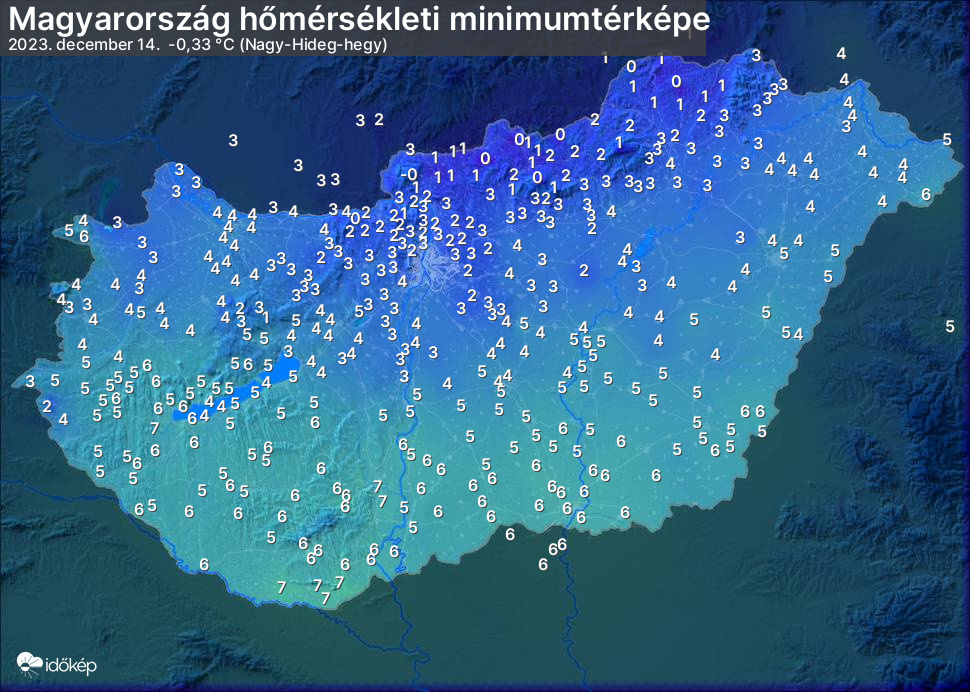 A minimumtérképen kirajzolódik az adott éjszaka mért legalacsonyabb hőmérsékletek térbeli eloszlása. Az adott nap hőmérsékleti minimumát télen előző este 7 és aznap reggel 7 óra, nyáron előző este 8 és aznap reggel 8 óra között mért legalacsonyabb értékkel adjuk meg. Adatbeküldés: aznap délután 4 óráig.