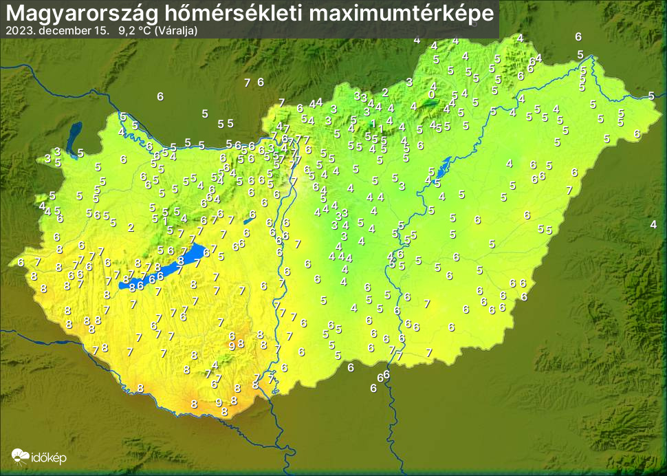 A maximumtérképen kirajzolódik az adott napon mért legmagasabb hőmérsékletek térbeli eloszlása. Az adott nap hőmérsékleti maximumát télen reggel és este 7 óra, nyáron reggel és este 8 óra között mért legmagasabb értékkel adjuk meg. Adatbeküldés: következő nap reggel 4 óráig.