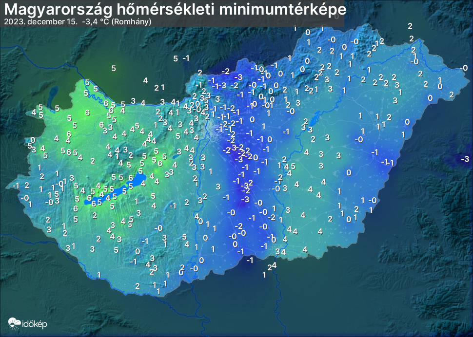 A minimumtérképen kirajzolódik az adott éjszaka mért legalacsonyabb hőmérsékletek térbeli eloszlása. Az adott nap hőmérsékleti minimumát télen előző este 7 és aznap reggel 7 óra, nyáron előző este 8 és aznap reggel 8 óra között mért legalacsonyabb értékkel adjuk meg. Adatbeküldés: aznap délután 4 óráig.