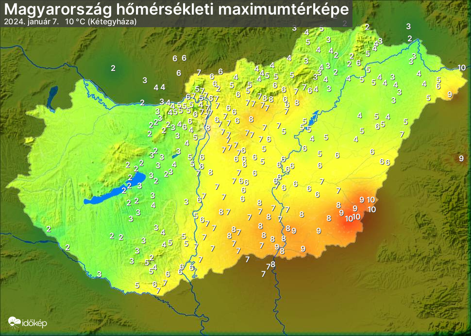 A maximumtérképen kirajzolódik az adott napon mért legmagasabb hőmérsékletek térbeli eloszlása. Az adott nap hőmérsékleti maximumát télen reggel és este 7 óra, nyáron reggel és este 8 óra között mért legmagasabb értékkel adjuk meg. Adatbeküldés: következő nap reggel 4 óráig.
