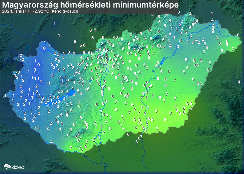 A minimumtérképen kirajzolódik az adott éjszaka mért legalacsonyabb hőmérsékletek térbeli eloszlása. Az adott nap hőmérsékleti minimumát télen előző este 7 és aznap reggel 7 óra, nyáron előző este 8 és aznap reggel 8 óra között mért legalacsonyabb értékkel adjuk meg. Adatbeküldés: aznap délután 4 óráig.