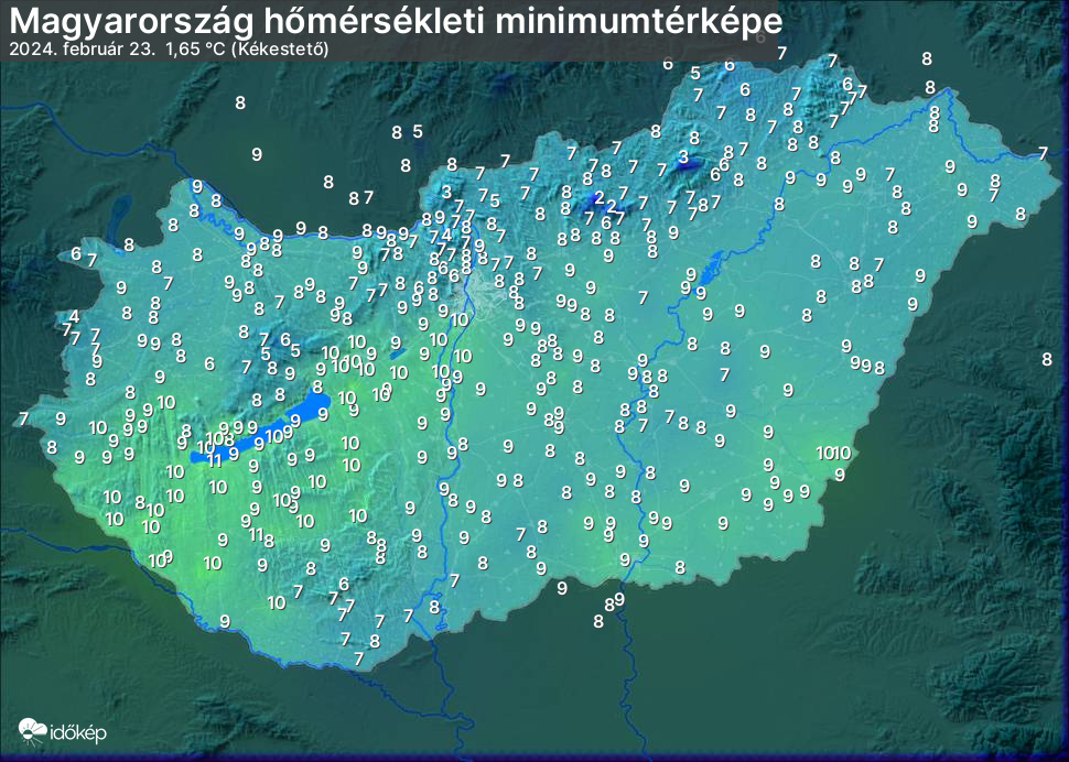 A minimumtérképen kirajzolódik az adott éjszaka mért legalacsonyabb hőmérsékletek térbeli eloszlása. Az adott nap hőmérsékleti minimumát télen előző este 7 és aznap reggel 7 óra, nyáron előző este 8 és aznap reggel 8 óra között mért legalacsonyabb értékkel adjuk meg. Adatbeküldés: aznap délután 4 óráig.
