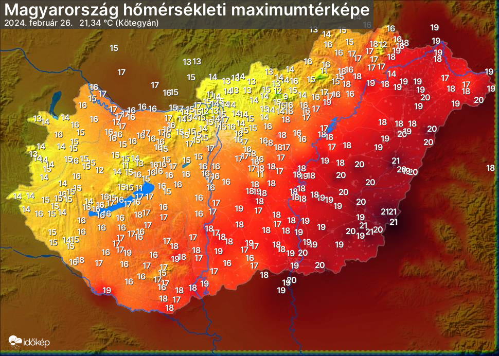 A maximumtérképen kirajzolódik az adott napon mért legmagasabb hőmérsékletek térbeli eloszlása. Az adott nap hőmérsékleti maximumát télen reggel és este 7 óra, nyáron reggel és este 8 óra között mért legmagasabb értékkel adjuk meg. Adatbeküldés: következő nap reggel 4 óráig.